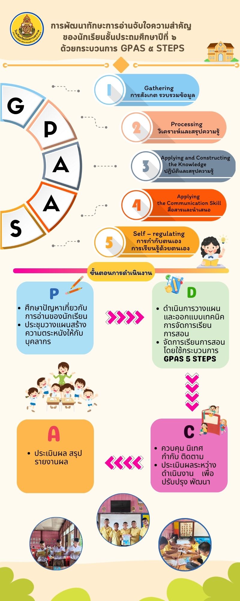 การประกวดโรงเรียนที่มีผลการปฏิบัติที่เป็นเลิศ (Best Practices) ด้านการพัฒนาคุณภาพการเรียนการสอนภาษาไทยอง การพัฒนาทักษะการอ่านจับใจความสำคัญของนักเรียนชั้นประถมศึกษาปีที่ ๖ ด้วยกระบวนการ GPAS ๕ STEPSโดยนางสาวอาทิตยา โพธิ๋อุดม