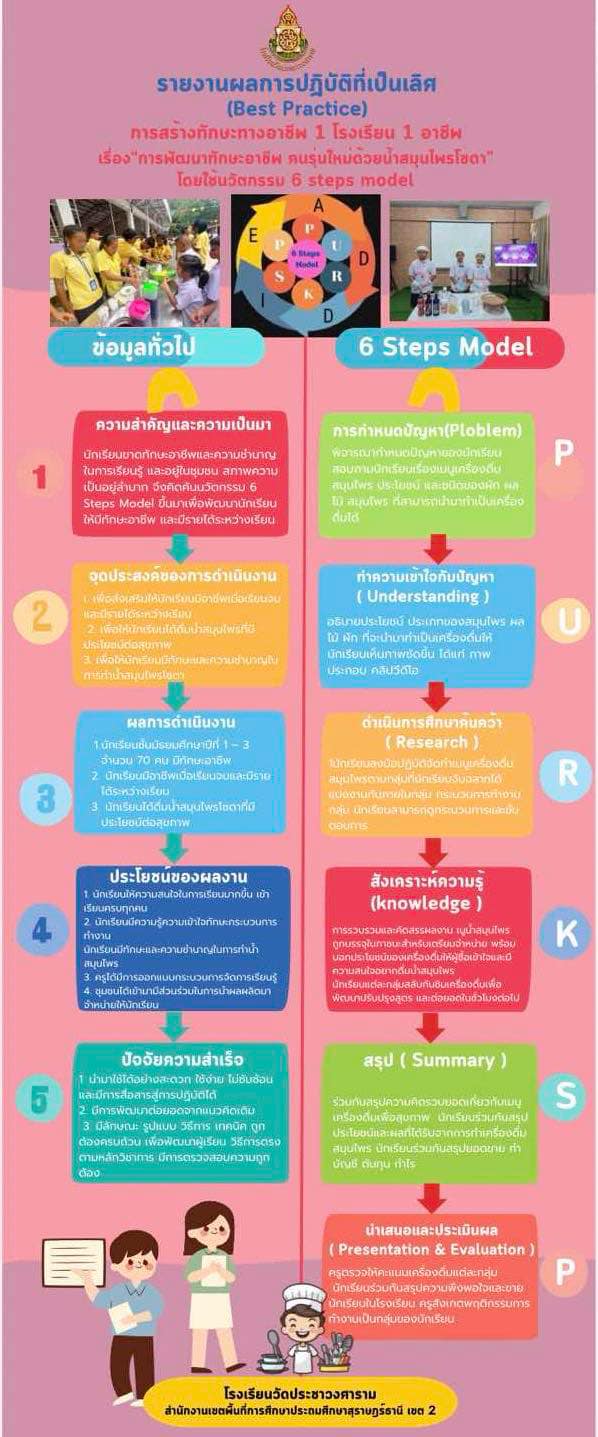 รายงานผลการปฎิบัติที่เป็นเลิศ (Best Practice) การสร้างทักษะทางอาชีพ 1 โรงเรียน 1อาชีพ เรื่องการพัฒนาทักษะอาชีพ คนรุ่นใหม่ด้วยน้ำสมุนไพรโซดาโดยใช้นวัตกรรม 6 Stept Model โดยนางสุดารัตน์ พรหมทอง