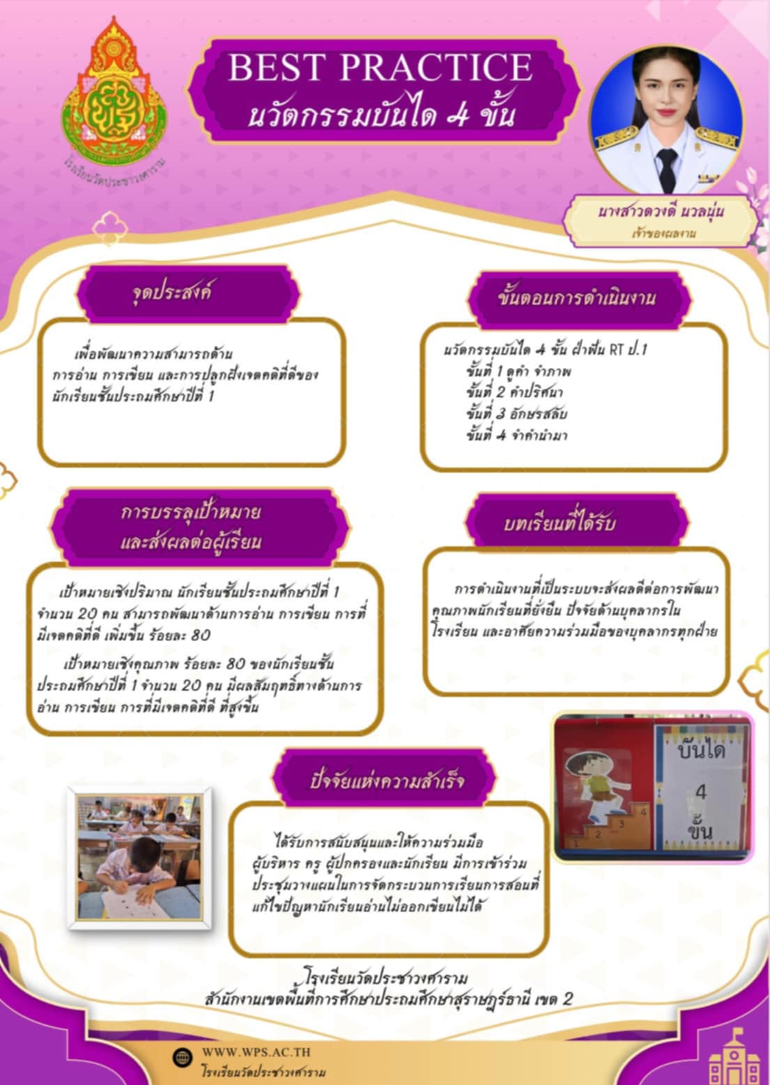 วิธีปฏิบัติที่เป็นเลิศ (Best Practices) ด้านการพัฒนาคุณภาพการเรียนการสอนภาษาไทย เรื่อง นวัตกรรมบันได 4 ขั้น ฝ่าฟัน RT ป.1 โดยนางสาวดวงดี นวลนุ่น