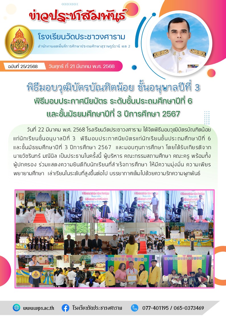 พิธีมอบวุฒิบัตรบัณฑิตน้อย ชั้นอนุบาลปีที่ 3 พิธีมอบประกาศนียบัตร ระดับชั้นประถมศึกษาปีที่ 6 และชั้นมัธยมศึกษาปีที่ 3 ปีการศึกษา 2567