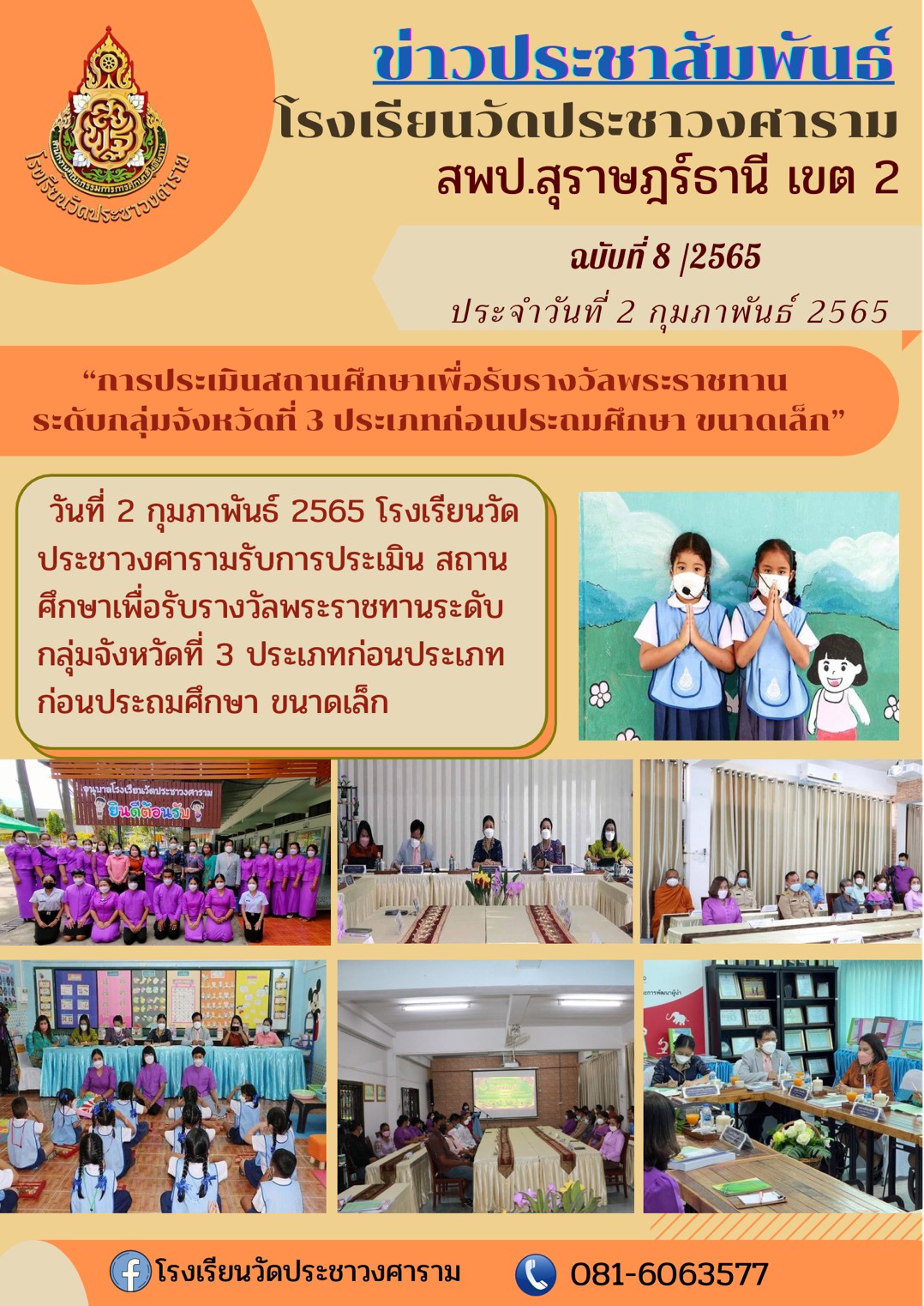 | วันที่ 2 กุมภาพันธ์ 2565 โรงเรียนวัดประชาวงศารามรับการประเมิน สถานศึกษาเพื่อรับรางวัลพระราชทานระดับกลุ่มจังหวัดที่ 3 ประเภทก่อนประถมศึกษา ขนาดเล็ก |