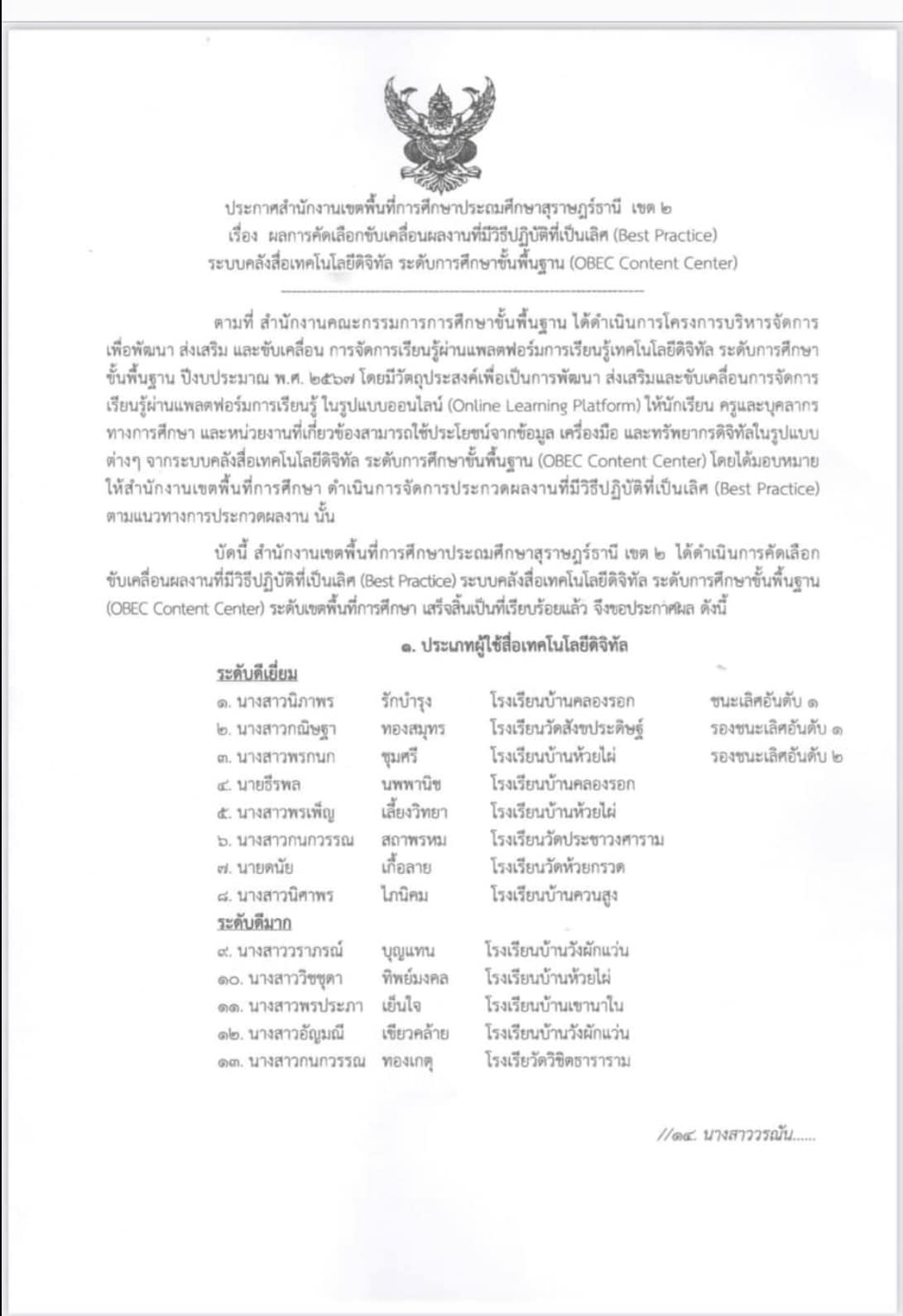 ชื่อผลงาน : การคัดเลือกขับเคลื่อนผ่านผลงานที่มีวิธีปฎิบัติเป็นเลิศ (Best Practice) ระบบคลังสื่อเทคโนโลยีดิจิทัล ระดับขั้นพื้นฐาน OBEC Content Center ประเภทผู้ใช้สื่อเทคโนโลยีดิจิทัล